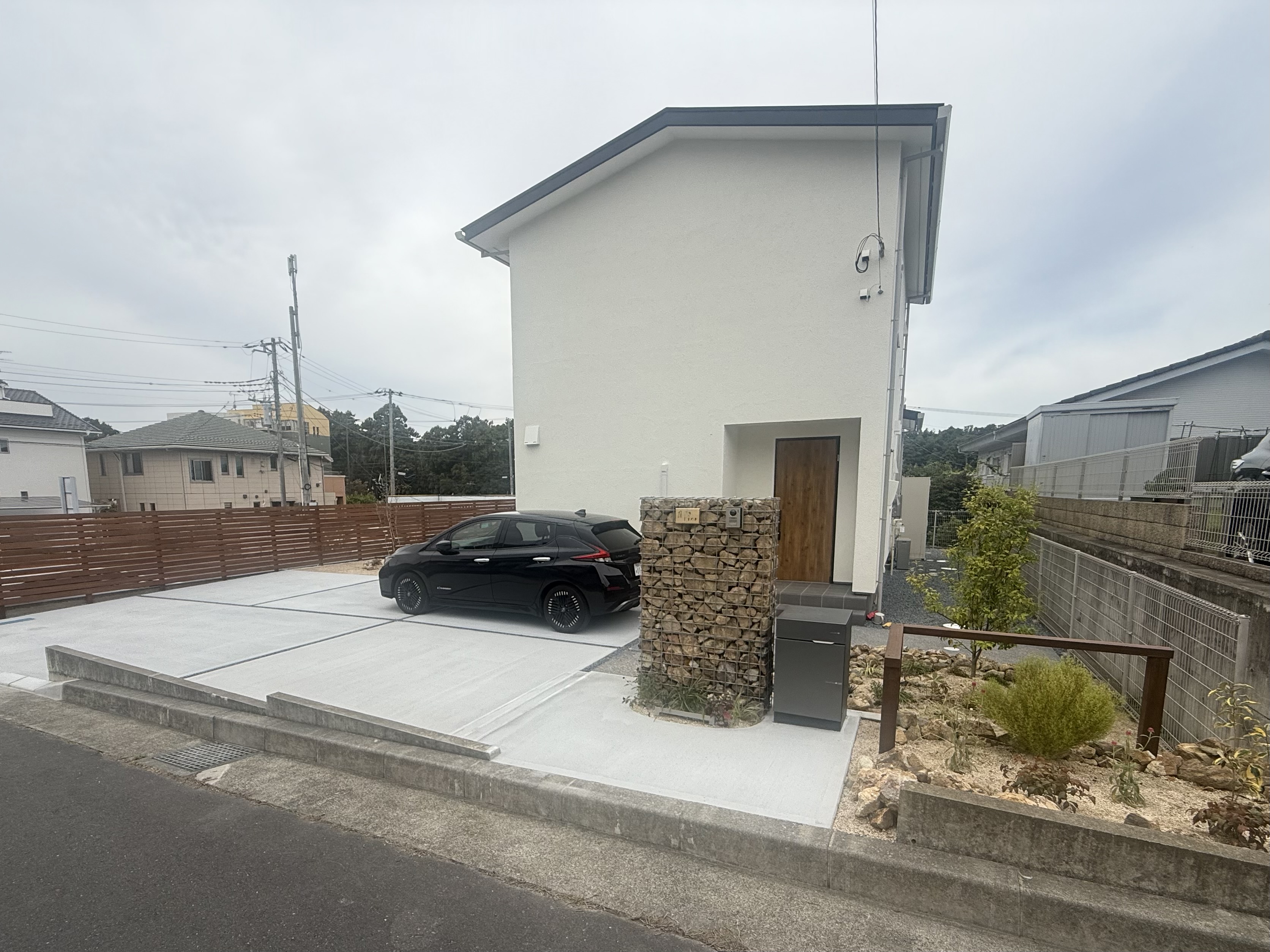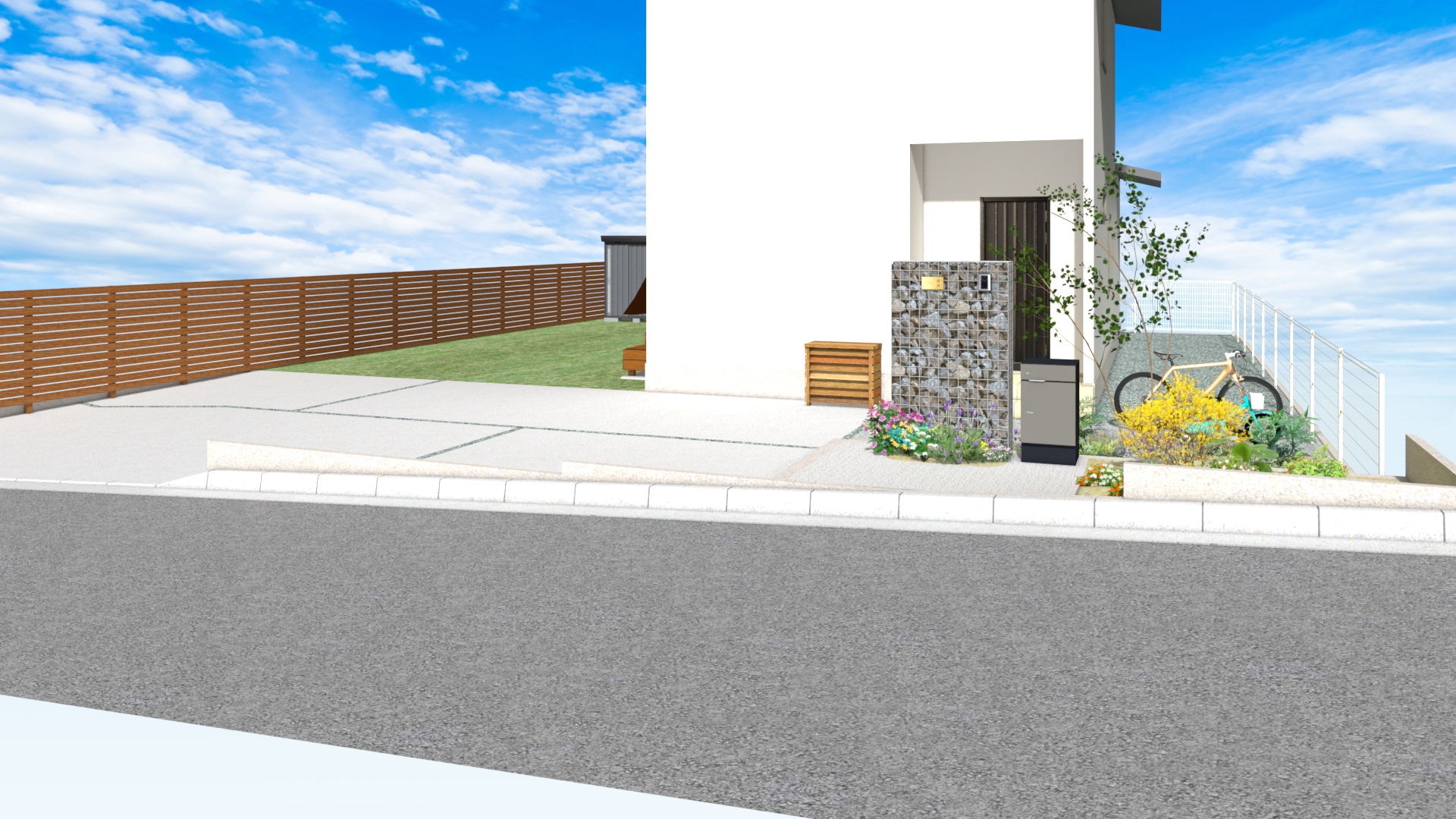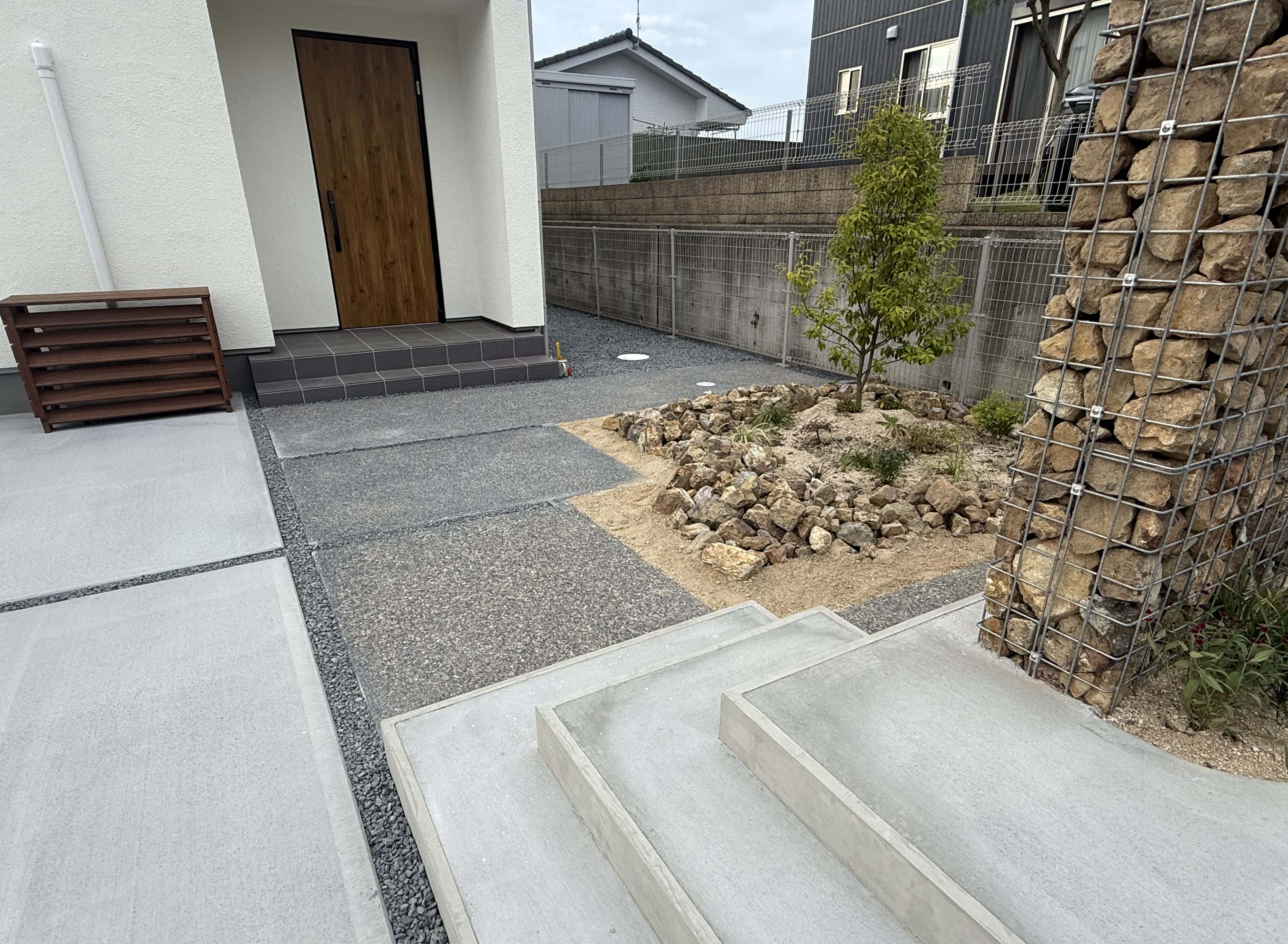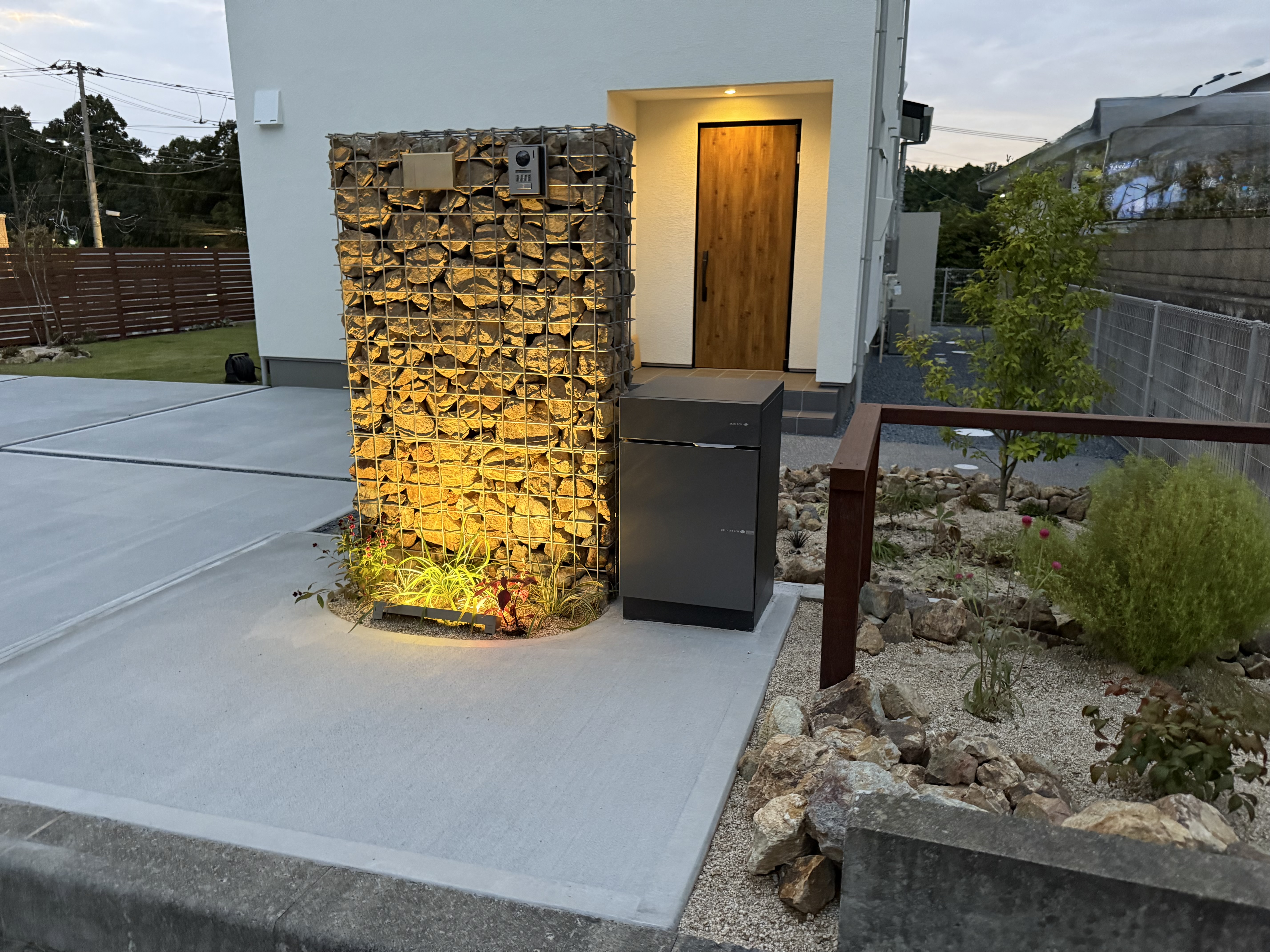 - 施工内容:外構一式(ガビオン門柱・宅配ボックス・アプローチ階段・洗い出し舗装・ウリンデッキ・ウリンフェンス・室外機カバー・三角屋根物置・植栽・芝張り・照明)