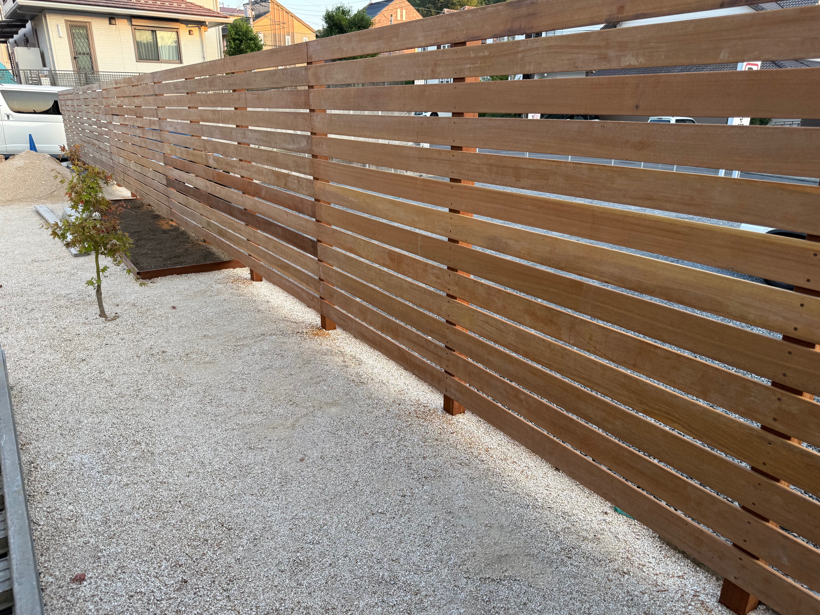 外周のウリンフェンス(ウッドフェンス)は横張りデザインで、適度な抜け感を保ちながらプライバシーを確保しています。