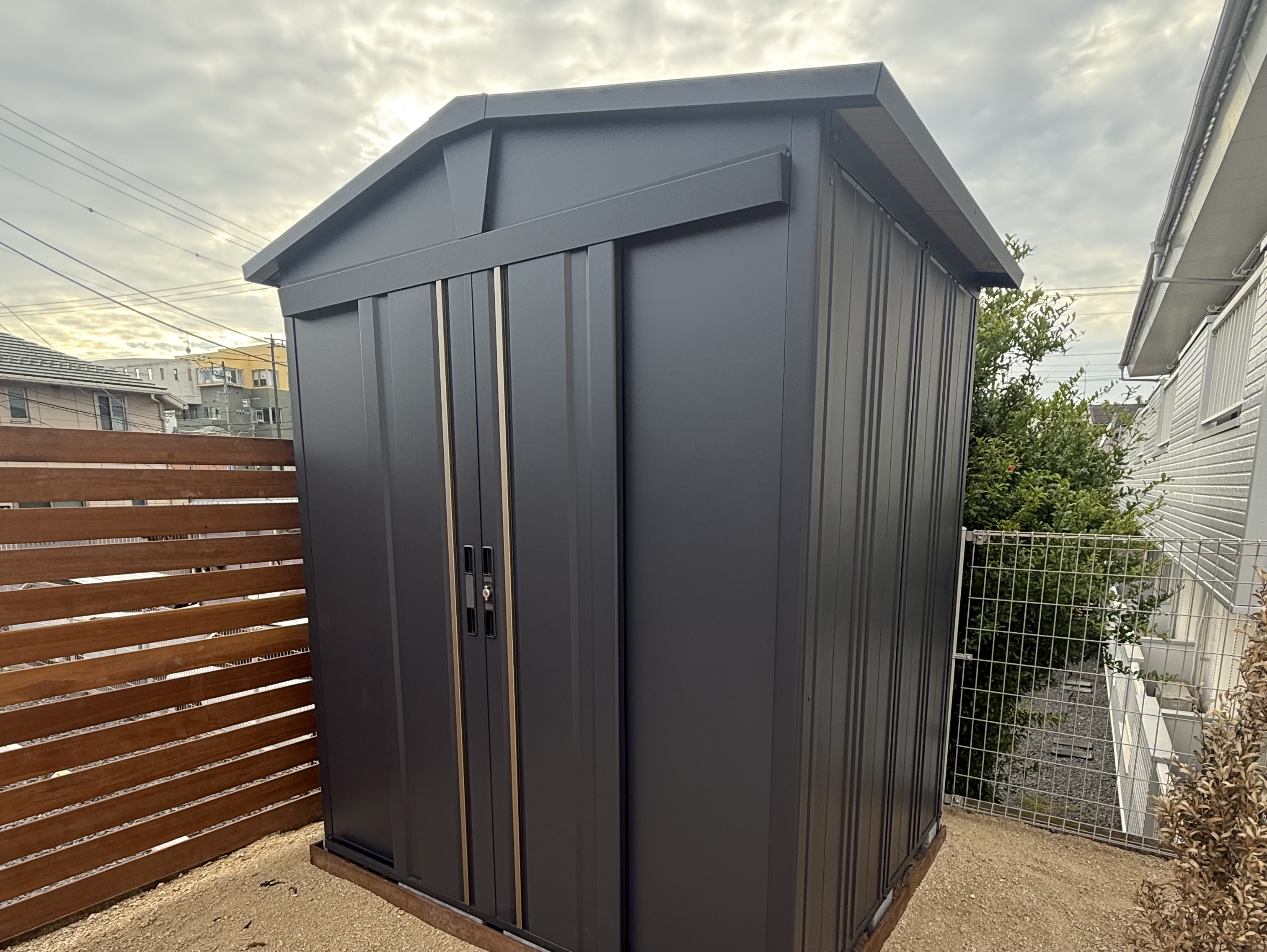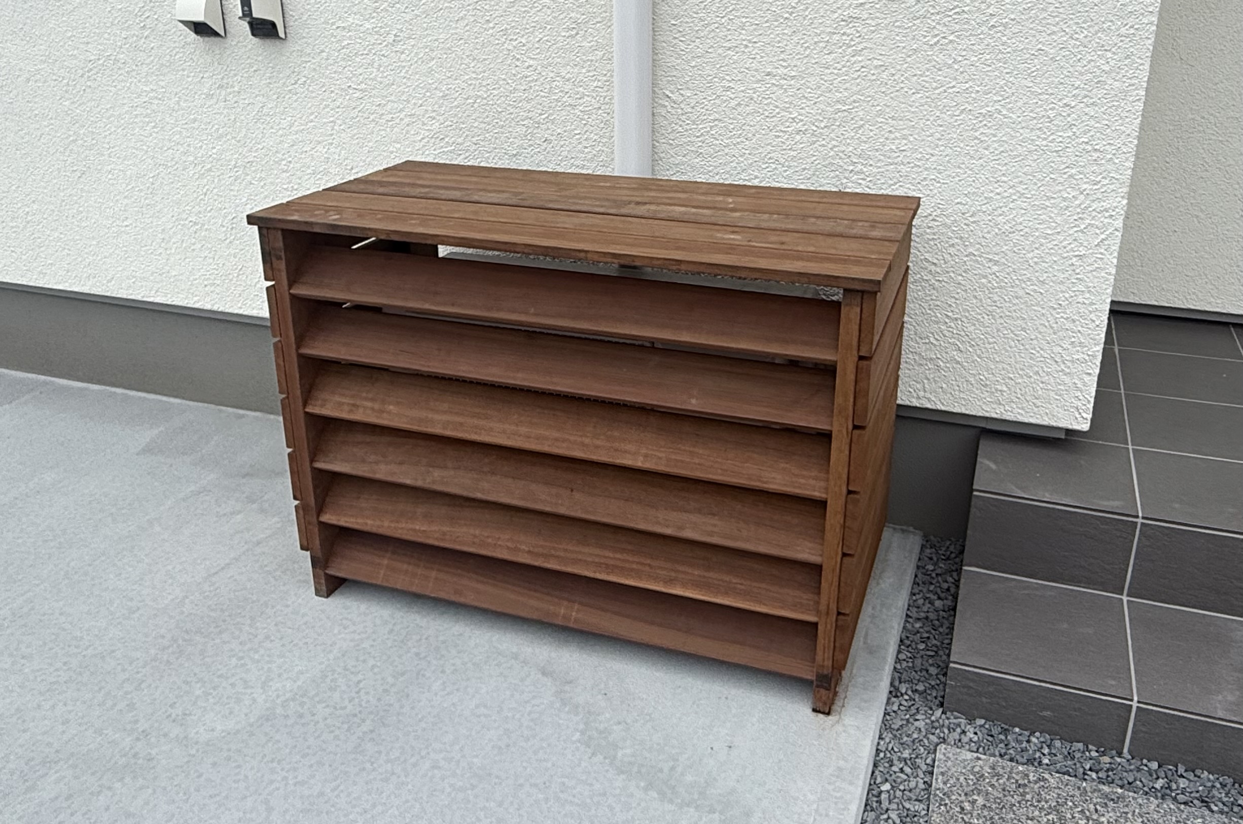 ダークグレーの外観にウリン材と対照的に映え、デザイン性と収納性を兼ね備えた仕上がりとなりました。