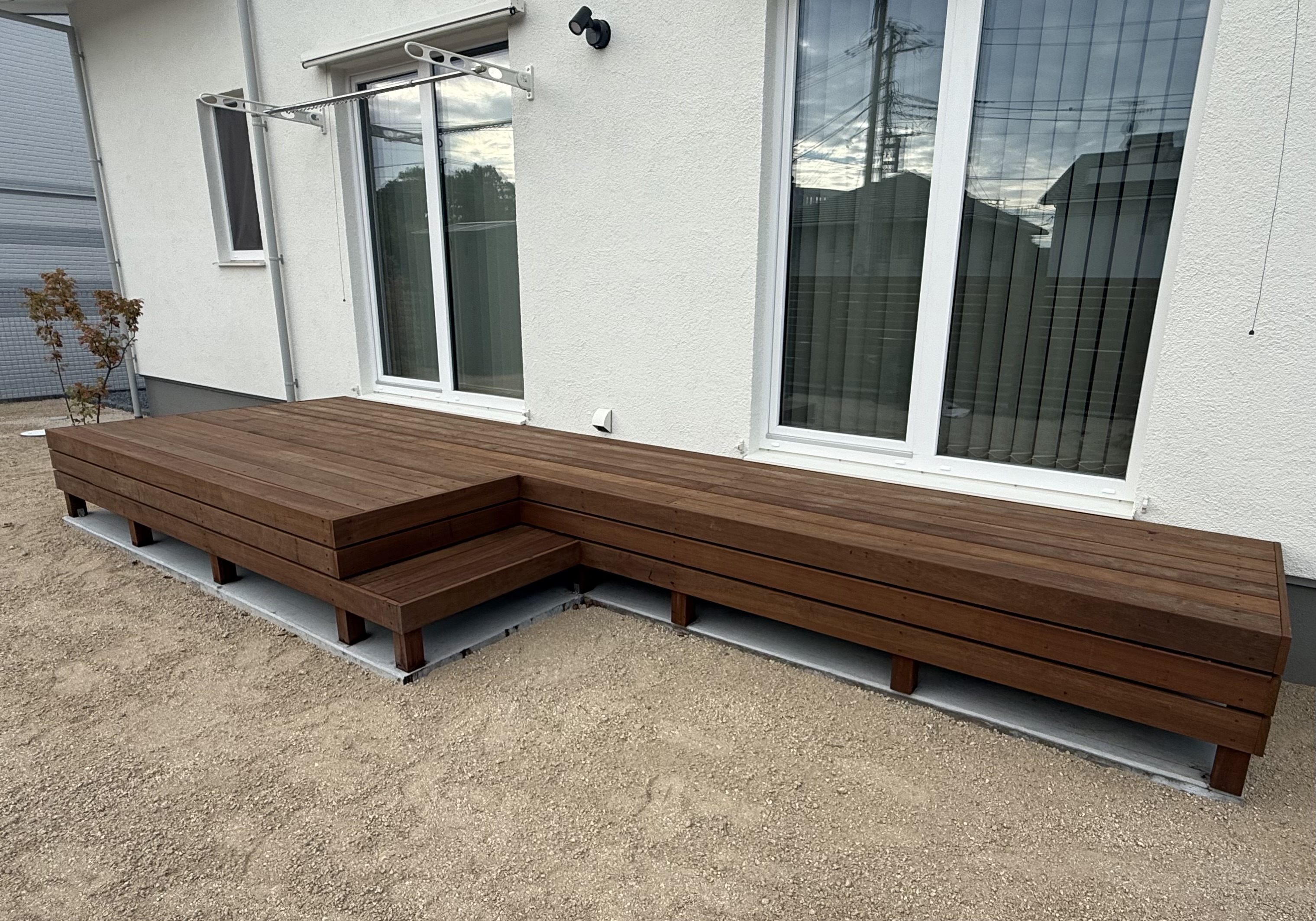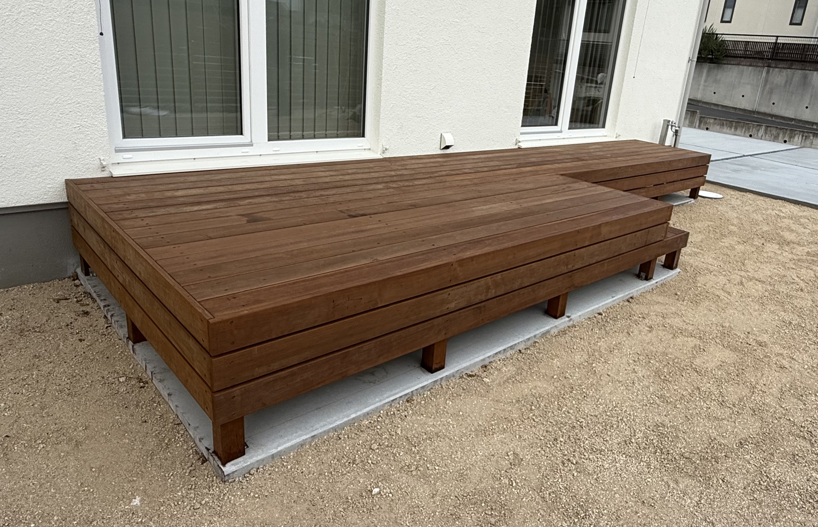 庭の主役となるウッドデッキには、耐久性抜群の**ハードウッド「ウリン」**を採用。