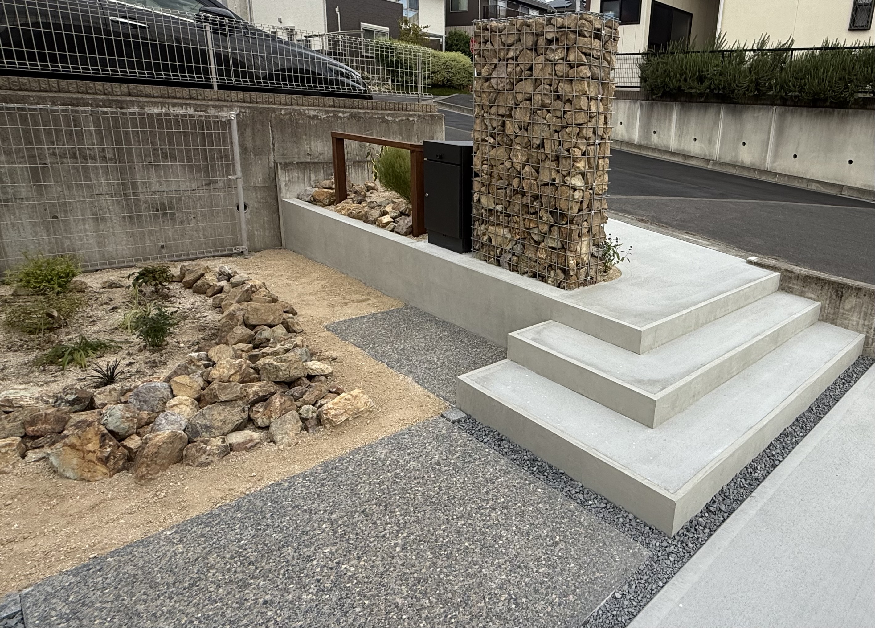 門柱には存在感ある**ガビオン(石積み門柱)**を採用し、無機質になりがちなコンクリートに自然石の温かみをプラス。