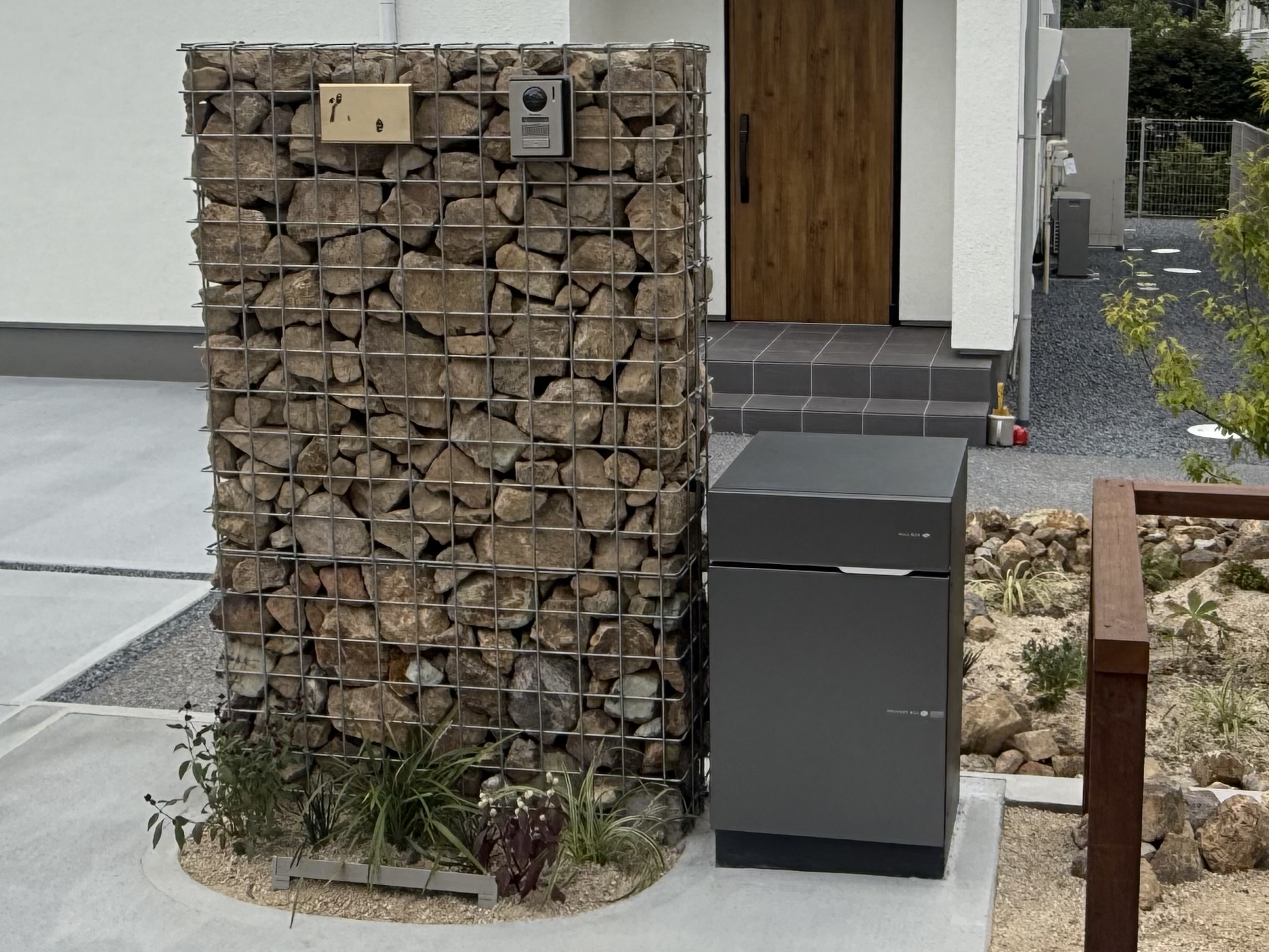 重厚感のあるガビオン門柱に、前入れ後ろ取り出しタイプのポスト&宅配ボックスを組み合わせました。
