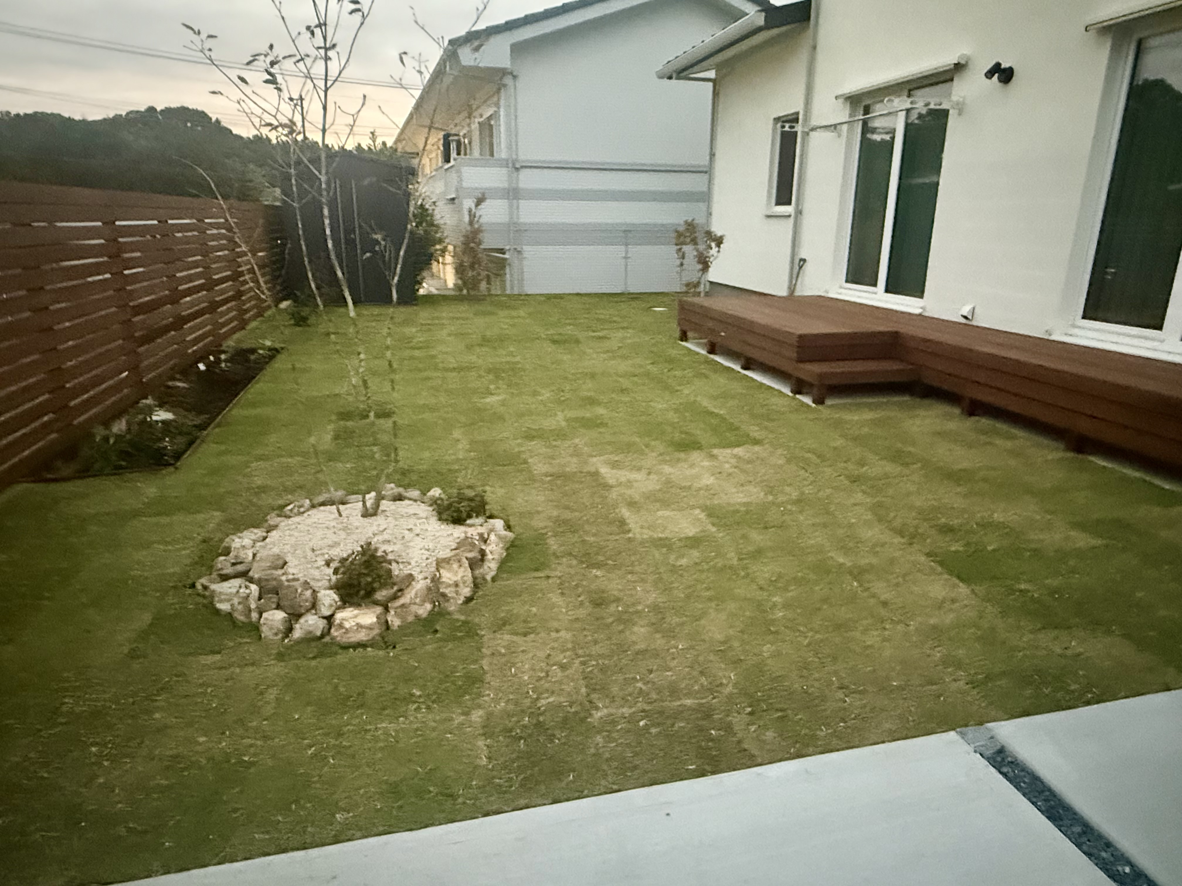 庭全体にはTM-9芝を敷き詰め、柔らかいグリーンが空間全体を明るく演出。